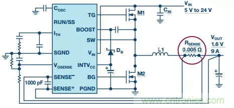 使用RSENSE和DCR兩種檢測(cè)方法時(shí),由于檢測(cè)信號(hào)較小,故均需要開爾文檢測(cè)。必須讓開爾文檢測(cè)痕跡(圖5中的SENSE+和 SENSE-)遠(yuǎn)離高噪聲覆銅區(qū)和其他信號(hào)痕跡,以將噪聲提取降至最低,這點(diǎn)很重要。某些器件(如LTC3855)具有溫度補(bǔ)償DCR檢測(cè)功能,可提高整個(gè)溫度范圍內(nèi)的精度。