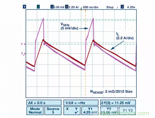對(duì)于降壓調(diào)節(jié)器,電流檢測(cè)電阻有多個(gè)位置可以放置。當(dāng)放置在頂部MOSFET的高端時(shí)(如圖3所示),它會(huì)在頂部MOSFET 導(dǎo)通時(shí)檢測(cè)峰值電感電流,從而可用于峰值電流模式控制電源。但是,當(dāng)頂部MOSFET關(guān)斷且底部MOSFET導(dǎo)通時(shí),它不測(cè)量電感電流。
