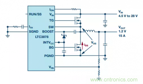 利用MOSFET RDS(ON)進(jìn)行電流檢測(cè),可以實(shí)現(xiàn)簡(jiǎn)單且經(jīng)濟(jì)高效的電流檢測(cè)。LTC3878是一款采用這種方法的器件。它使用恒定導(dǎo)通時(shí)間谷值模式電流檢測(cè)架構(gòu)。頂部開關(guān)導(dǎo)通固定的時(shí)間,此后底部開關(guān)導(dǎo)通,其RDS壓降用于檢測(cè)電流谷值或電流下限。