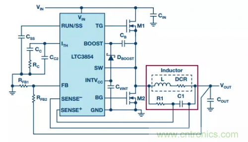 電路不直接測(cè)量電感電流,因此無法檢測(cè)電感飽和。推薦使用軟飽和的電感,如粉芯電感。與同等鐵芯電感相比,此類電感的磁芯損耗通常較高。與RSENSE方法相比,電感DCR檢測(cè)不存在檢測(cè)電阻的功率損耗,但可能會(huì)增加電感的磁芯損耗。