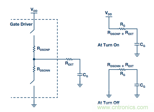 率。如圖4所示,高端導通電阻和外部串聯電阻REXT構成充電路徑中的柵極電阻,低端導通電阻和REXT構成放電路徑中的柵極電阻。