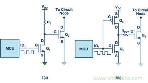 考慮一個具有微控制器的數字邏輯系統,其I/O引腳之一上可以輸出一個0 V至5 V的PWM信號。這種PWM將不足以使電源系統中使用的功率器件完全導通,因為功率器件的驅動電壓一般超過標準CMOS/TTL邏輯電壓。因此,邏輯/控制電路和高功率器件之間需要一個接口。這可以通過驅動一個邏輯電平n溝道MOSFET,其進而驅動一個功率MOSFET來實現,如圖1a所示。