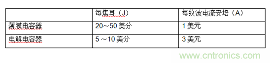 薄膜或電解電容器的相對成本可以從大容量存儲或處理波紋能力角度進行分析。如表2匯總的結果所示,2013年公布的數據1比較了由整流440VAC電源供電的直流總線典型成本: