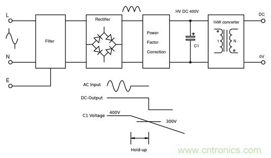 例如,對于用作1kW離線轉換器的大容量電容,通過比較電解電容器和薄膜電容器可以清楚地說明這兩種類型電容器之間的特性差異。 如圖1所示,該轉換器具有功率因數校正前端,且具有400V的標稱直流總線電壓(Vn)。