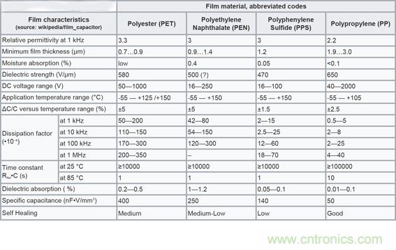 表1比較了常用薄膜電容器類型的特性。聚酯類可在低電壓下使用,而聚丙烯由于其低損耗因數(DF)和單位厚度的高介電擊穿能力,因此通常在高應力下表現出最低的損耗和最高的可靠性。DF相對比較穩定,不隨溫度和頻率有很大變化。 分段高結晶金屬化聚丙烯也可采用,并且能提供與鋁電解電容相當的能量密度。