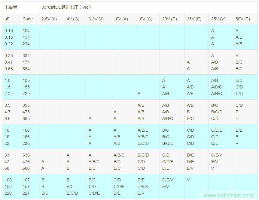 AVX 常規系列(TAJ)貼片鉭電容:容量和額定電壓(字母表示封裝大小)
