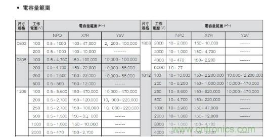 容量與電壓和尺寸的范圍關系表