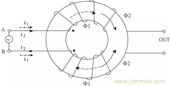 在開(kāi)關(guān)電源中,由于整流二極管和濾波電容以及電感中的電流或電壓急劇變化,產(chǎn)生電磁干擾源(noise),同時(shí)輸入電源中也存在工頻以外的高次諧波噪聲,這些干擾若不加以扼制,將對(duì)負(fù)載設(shè)備或開(kāi)關(guān)電源本身造成損害,因此若干國(guó)家之安規(guī)機(jī)構(gòu)對(duì)電磁干擾(EMI)發(fā)射量均作出了相應(yīng)的管制規(guī)定。當(dāng)前開(kāi)關(guān)電源的開(kāi)關(guān)頻率日趨高頻化EMI也隨之日益嚴(yán)重,所以開(kāi)關(guān)電源中均須設(shè)置EMI濾波器,EMI濾波器需對(duì)常模及共模噪聲均作出相應(yīng)的抑制,以達(dá)到某一規(guī)定標(biāo)準(zhǔn)。常模濾波器負(fù)責(zé)濾出輸入或輸出端兩根線間之差模干擾信號(hào),共模濾波器負(fù)責(zé)濾出兩條入線之共模干擾信號(hào)。實(shí)際共模電感因其工作環(huán)境不同,又可分為AC CM.M.CHOKE;DC CM.M.CHOKE和SIGNAL CM.M.CHOKE三種,在設(shè)計(jì)或選用時(shí)應(yīng)于以區(qū)分。但其工作原理完全相同,工作原理如圖(1)所示: