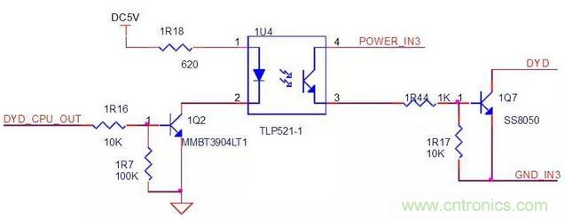 “DYD_CPU_OUT”連接LPC2367,輸出高低電平,低電平,1U4不通,1Q7不通,UCE=12V,1Q7-3=12V,線圈兩端電壓為0V。