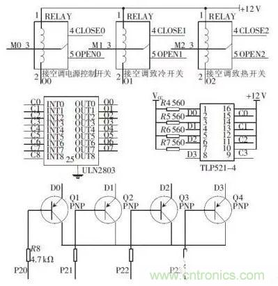 繼電器開(kāi)關(guān)模塊由TLP521 -4 、ULN2803 和SRD -12VDC 及三極管構(gòu)成,由微控制器輸出的信號(hào)經(jīng)過(guò)三極管構(gòu)成的開(kāi)關(guān)電路送往TLP521 -4 光耦芯片再通過(guò)ULN2803 達(dá)林頓管的放大后用來(lái)驅(qū)動(dòng)SRD-12DC 繼電器,進(jìn)而達(dá)到控制空調(diào)的各種開(kāi)關(guān)的作用, 繼電器開(kāi)關(guān)控制模塊與微控制器的電路連接圖如圖3 所示。