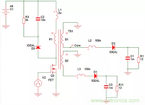 例如,一個反激式電源可分別從一個48V輸入產(chǎn)生兩個1 A的12V輸出,如圖1的簡化仿真模型所示。理想的二極管模型具有零正向壓降,電阻可忽略不計。變壓器繞組電阻可忽略不計,只有與變壓器引線串聯(lián)的寄生電感才能建模。這些電感是變壓器內(nèi)的漏電感,以及印刷電路板(PCB)印制線和二極管內(nèi)的寄生電感。當設(shè)置這些電感時,兩個輸出相互跟蹤,因為當二極管在開關(guān)周期的1-D部分導(dǎo)通時,變壓器的全耦合會促使兩個輸出相等。