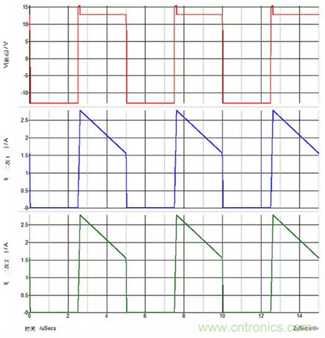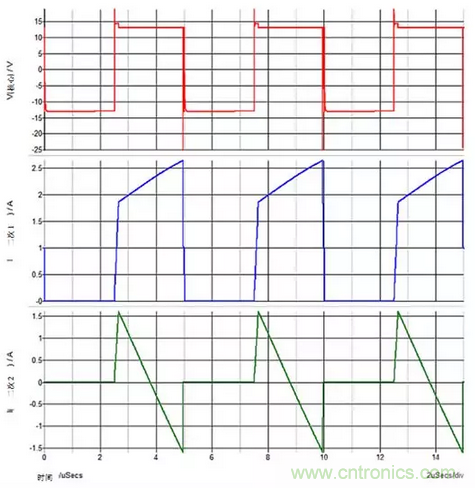 圖2:當對兩個輸出施加重載時,在整個1-D周期內(nèi),次級繞組電流在兩個次級繞組中流動。您可以看到上方紅色跡線上的基座電壓。