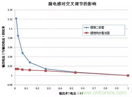 圖5:該圖顯示了兩個輸出之間的交叉調(diào)節(jié),其中1號輸出上的1-A負載保持穩(wěn)定,而2號輸出上的負載不斷變化,從而凸顯了同步整流器如何減輕漏電感的影響。