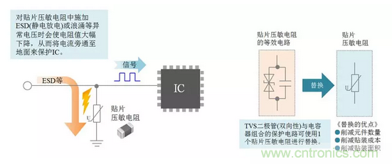 同時,在移動設備中,開關及麥克風的小孔會成為人體產(chǎn)生的ESD的入口,因此需要采取ESD對策。貼片壓敏電阻可保護電路免受ESD(靜電放電)及浪涌等的影響,同時在通常情況下發(fā)揮著電容器的功能,因此還擁有抑制噪音的效果(圖3)。