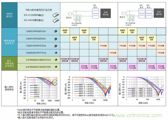TDK推薦用于抑制麥克風線蜂窩網(wǎng)絡頻帶(700MHz~1GHz、 1.5GHz~2.8GHz)以及WiFi (2.4GHz、3~5GHz) 的TDMA噪音、改善接收靈敏度、抑制ESD的MAF系列與貼片壓敏電阻AVR系列的產(chǎn)品組合示例如下所示(圖9)。