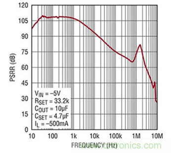 圖2:該圖顯示高性能LDO的PSRR頻率響應(yīng):在1kHz時,良好LDO的基準(zhǔn)值介于60dB至110dB之間。(圖片來源:Analog Devices)