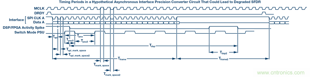 在圖15中,標記了各種定時周期,這很容易干擾SFDR或?qū)е露秳印H绻鸖PI通信未頻鎖到MCLK,則可能發(fā)生雜散。掌握布局技術是您緩解此問題的最大保障。頻率表現(xiàn)為混疊下行干擾源,但也作為拍頻和交調(diào)產(chǎn)物。例如,如果SPI在16.01 MHz下運行,MCLK在16 MHz下運行,則應在10 kHz下發(fā)生雜散。