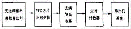 另一種模擬量傳輸?shù)慕鉀Q方法,就是采用VFC(電壓頻率轉(zhuǎn)換)方式,如圖3所示。現(xiàn)場變送器輸出模擬量信號(假設(shè)電壓信號),電壓頻率轉(zhuǎn)換器將變送器送來的電壓信號轉(zhuǎn)換成脈沖序列,通過光耦隔離后送出。在主機(jī)側(cè),通過一個頻率電壓轉(zhuǎn)換電路將脈沖序列還原成模擬信號。此時,相當(dāng)于光耦隔離的是數(shù)字量,可以消除光耦非線性的影響。這是一種有效、簡單易行的模擬量傳輸方式。