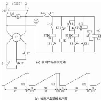 此測試電路的缺點是:電路較為復雜,另外對被測產品不同的電壓規格不夠兼容(如被測產品其它電壓規定,則需對此電路需加改進);每次檢測產品數量少(單只產品),延時記錄需人工對每次測試結果進行記錄,并最終對其記錄數據進行計算處理;保持用KT1和休止用KT2兩個時間繼電器需根據產品延時時間進行相應設置。