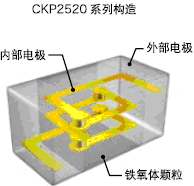 - CKP2520系列是在薄膜上印刷內部電極,通過通孔實現層間的連接,使內部電極在螺旋上形成的