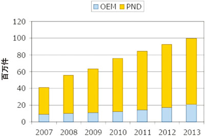 汽車導(dǎo)航市場中,根據(jù)ST公司的估計,2008年P(guān)ND的出貨量同比將增長43%,從2007年的3200萬件增長到4600萬件。主要增長動力依然來自車載導(dǎo)航市場的低于水準的普及率,對市場的教育和推廣的力度依然不夠。低成本的OEM導(dǎo)航儀(兩用便攜導(dǎo)航儀)將會在中級汽車中開辟新的市場,預(yù)計到2012年在歐美新售的汽車中,車載導(dǎo)航儀占有率將超過25%。2007-2013年OEM儀表板內(nèi)置導(dǎo)航儀的年均增長率將達到15%,便攜式導(dǎo)航儀的增長速度為16%,預(yù)計到2013年導(dǎo)航市場規(guī)模將達到汽車影響的水平。