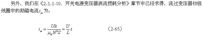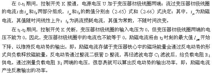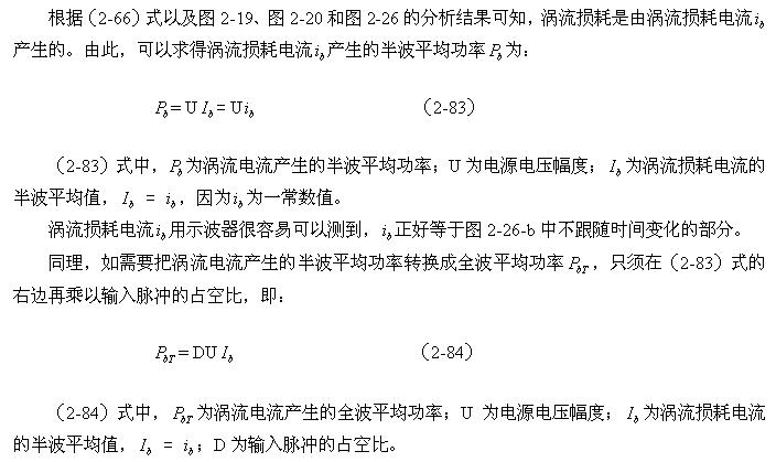 順便指出:(2-84)式的結(jié)果,是認(rèn)為渦流損耗在t1-t2期間(圖2-26-b)完全等于0而求得的,但實(shí)際上,在t1-t2期間變壓器初級線圈產(chǎn)生的反電動勢同樣也會在變壓器鐵芯中感應(yīng)產(chǎn)生渦流損耗電流,即當(dāng)輸入電壓為0時(shí)刻,在變壓器鐵芯中還存在很短暫時(shí)間的渦流損耗;由于這種渦流損耗是由反電動勢提供能量來維持的,它將隨著反電動勢能量的衰減很快就衰減到0。