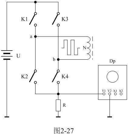 圖2-27中,U是電源電壓,N為變壓器初級(jí)線圈,控制開關(guān)K1、K2、K3、K4組成橋式開關(guān)控制電路,K1和K4為一組,K2和K3為一組,兩組開關(guān)輪流接通與斷開,把電源電壓正反向加于變壓器初級(jí)線圈兩端;R為取樣電阻,通過測(cè)量R兩端的電壓,就可以知道流過變壓器初級(jí)線圈的電流;取樣電壓被送到示波器Dp進(jìn)行顯示。