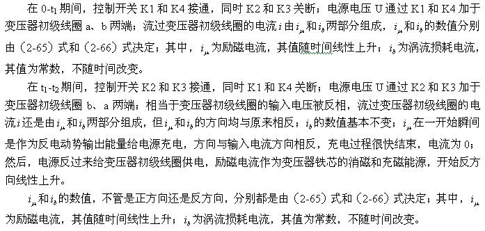 根據(jù)前面分析,磁滯損耗主要由勵(lì)磁電流 產(chǎn)生的,但雙激式開關(guān)變壓器初級(jí)線圈中的勵(lì)磁電流與單激式開關(guān)變壓器初級(jí)線圈中的勵(lì)磁電流產(chǎn)生的作用并不完全相同。單激式開關(guān)變壓器初級(jí)線圈中的勵(lì)磁電流產(chǎn)生磁場(chǎng)對(duì)變壓器貼芯進(jìn)行充磁和退磁外,其存儲(chǔ)的能量只能用來作為反激式輸出給負(fù)載,因?yàn)樽儔浩鞒跫?jí)線圈輸入的電壓是單極性脈沖,變壓器初級(jí)線圈無法換相。