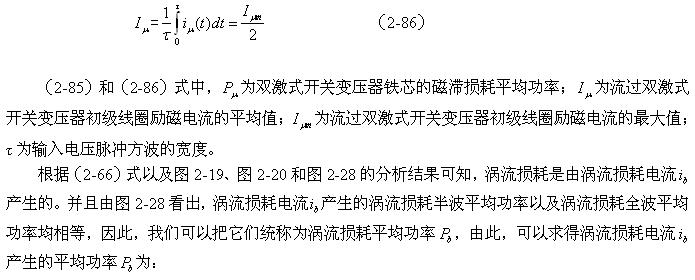在雙激式變壓器鐵芯中,磁滯損耗也是由流過變壓器初級(jí)線圈勵(lì)磁電流產(chǎn)生的磁場(chǎng)在鐵芯中產(chǎn)生的;但在單激式變壓器鐵芯中,有一部分勵(lì)磁電流存儲(chǔ)的能量要轉(zhuǎn)化成反激式電壓向負(fù)載輸出;而在雙激式變壓器鐵芯中,勵(lì)磁電流產(chǎn)生的能量基本上都是用于充磁與消磁。因此,雙激式變壓器鐵芯的磁滯回線的面積比單激式變壓器鐵芯磁滯回線的面積大很多,磁滯損耗也大很多。