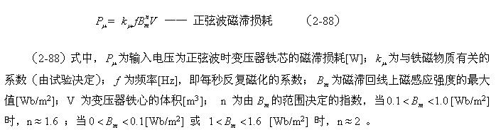 這里順便指出,利用(2-88)和(2-89)式來分別測(cè)試變壓器鐵心的磁滯損耗和渦流損耗是非常困難的;一個(gè)是它們的系數(shù)很難決定,另一個(gè)是兩者很難分別進(jìn)行測(cè)量,或從測(cè)量結(jié)果中進(jìn)行分離。對(duì)比兩式的參數(shù)就可以知道,它們之間最大的區(qū)別是頻率對(duì)損耗的影響程度;一個(gè)是與頻率成正比,另一個(gè)是與頻率的平方成正比。