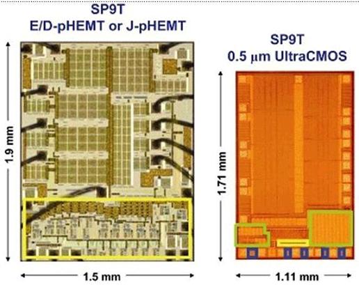 隨著多頻段手機越來越流行,對高整合度、小型天線開關的需求也越來越迫切。UltraCMOSSP7T開關現在已經開始量產,SP9T也在2007年底投入量產。在外形方面,GaAsSP7T為1.6x1.5mm,而采用0.5umSOS制程、具有相等或較小和較大信號性能的相似SP7T開關設計只有1.2x1.0mm,面積縮小了一半。目前已經可用的GaAsE/DpHemt或J-pHemtSP9T開關外形尺寸為1.9x1.5mm。與之相較,采用UltraCMOS0.5um制程制造的SP9T外形尺寸為1.7x1.1mm(圖3),它不需要外部ESD元件和性能增強匹配元件。依照UltraCMOS發展規劃,0.25um版本的SP9T尺寸將達到1.32x1.29mm。