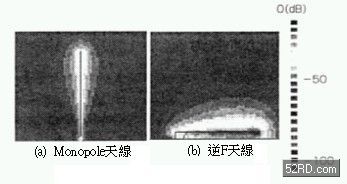 相較之下逆F天線的高度為λ/10屬於小型天線,此時F天線最大強度則只有0dB,由此可知即使相同電力隨著天線大小的差異,天線附近的電界(電壓)分布狀態則截然不同,同樣的磁界亦即電流強度也不相同。對小型天線而言構成天線的導體與天線周圍的空間,若是屬于有耗損性的媒體時,會就導致極大的電力(功率)損失,相對的效率也會急遽劣化。