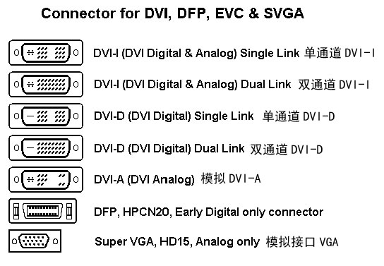 DVI-A是一種模擬傳輸標準,晚期的大屏幕專業(yè)CRT中能看見。不過由于和VGA沒有本質(zhì)區(qū)別,性能也不高,因此DVI-A事實上已經(jīng)被廢棄了。至于DFP接口,這是一種已經(jīng)被廢棄的早期的數(shù)字規(guī)范。