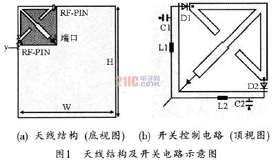 天線可以與手持設(shè)備電路板集成在一起,安裝在電路板的左上角,其結(jié)構(gòu)和RF-PIN開(kāi)關(guān)控制電路示意圖如圖1所示。