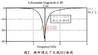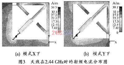 [page]由于兩種工作狀態(tài)下,天線的接地端不同,因此,天線的有效輻射部分也有所不同。當(dāng)處于X模式時(shí),天線結(jié)構(gòu)中垂直部分的微帶線接地,因此,天線的輻射部分應(yīng)該為水平部分的微帶,天線也相應(yīng)工作在水平極化方式。圖3所示為天線在2.44GHz時(shí)的射頻電流分布圖。