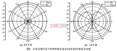 從圖3可以看出,射頻電流主要集中在天線水平方向的微帶線上(這印證了前面的分析)。但同時(shí),在中間部分的微帶以及天線其他部分也存在射頻電流,因此,天線仍會(huì)輻射部分垂直極化波。圖4所示為天線的兩種極化波在XY及YZ平面的方向圖。