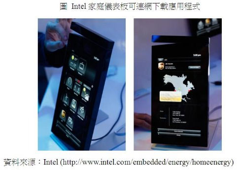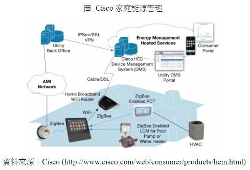 在綠色節能觀念的日益普及趨勢下,有效管理家中用電的家庭能源管理(Home Energy Management,HEM)成為智慧電網公共建設外,另一項具備高度發展潛力的市場領域。面對民眾對節能管理的需求,現階段陸續已有許多國際大廠投入相關應用與服務的研發;除了Google推出PowerMeter的用電監測網路平臺外(需搭配智慧電表或插座等設備),Cisco與Intel也陸續搭上平板電腦熱潮,推出協助民眾管理家庭用電的HEM裝置。相較于Google PowerMeter,Cisco與Intel所推出產品是以物聯網(Internet of Things,IoT)概念為基礎,透過無線網路模式連結家中各項電器設備,進行用電資訊的傳遞與監控,同時進行遠端遙控動作。 Cisco推出包含家庭能源控制器(Home Energy Controller,HEC)與能源管理服務平臺的家庭能源管理解決方案(Home Energy Management Solution,HEMS),作為進入家庭節能市場的第一步。 HEC如同家庭中的監控中心,除了可以在螢幕上即時顯示家中用電的即時狀態資訊外,使用者透過觸控面板的HEC還可以對連線的家電產品進行操控,決定是否關閉或調整特定家電來節省電力消耗。