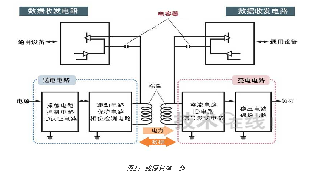 明日香電子開發的技術利用無線供電中的主流技術——電磁感應。最大特點是可利用一組線圈同時傳輸電力和數據(圖2)。在數據傳輸用途上,并不增設天線,而是沿用了供電線圈。通過利用基于電磁感應的磁場耦合現象,實現了數據和電力的同時傳輸。供電和數據傳輸使用不同的頻帶。這是通過“利用一組線圈產生兩個頻率”(明日香電子代表董事兼社長高石好)實現的。
