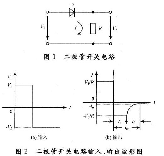 如圖1所示,輸入端施加一脈沖信號Vi,其幅值為+V1和-V2。當加在二極管兩端的電壓為+V1,二極管導通;當加在二極管兩端的電壓為-V2,二極管截止,輸入、輸出波形如圖2所示。二極管兩端的電壓由正向偏置+V1變為反向偏置-V2時,二極管并不瞬時截止,而是維持一段時間ts后,電流才開始減小,再經tf后,反向電流才等于靜態特性上的反向漂移電流I0,其值很小。ts稱為存貯時間,tf稱為下降時間,ts+tf=trr稱為關斷時間。二極管兩端的電壓由反向偏置-V2變為正向偏置+V1時,二極管也不是瞬時導通,而是經過導通延遲時間和上升時間后才穩定導通,這段時間稱為開通時間。顯然二極管的導通和截止時刻總是滯后加于其兩端高、低電平的時刻。二極管從截止轉為正向導通的開通時間,與從導通轉向截止時的關斷時間相比很小,其對開關速度的影響很小,在分析討論中主要考慮關斷時間的影響。