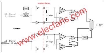 高速信號由AC通道來處理,信號在通道中首先從單端模式轉換為差分模式,然后被隔離層的電容-電阻網絡差分為許多瞬態。后面的比較器再將這些瞬態轉換為差分脈沖,從而設置和重置一個“或非”門觸發器。相當于原始輸入信號的觸發器輸出饋至判定邏輯(DCL)和輸出多路復用器。DCL包括一個看門狗定時器,該定時器用于測量信號轉換之間的持續時間。如果兩個連續轉換之間的持續時間超出定時窗口(如低頻信號的情況下),則DCL則指示輸出多路復用器從AC-通道切換到DC-通道。