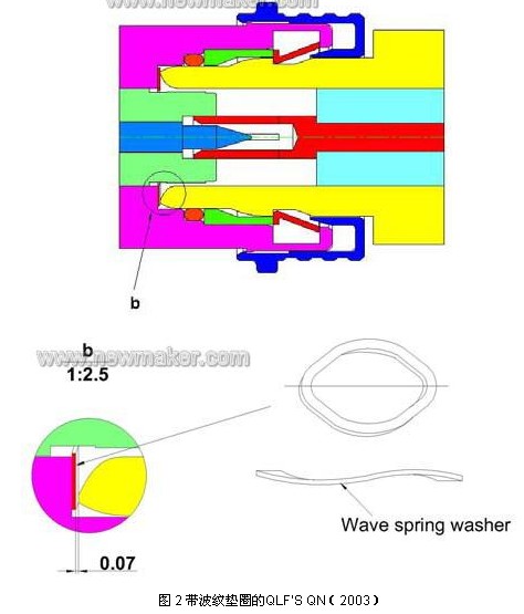 進步:由波浪墊圈改為碟形彈簧片 B3,外導體接觸由幾個點擴展成一個圈,接觸壓力也有所改善。