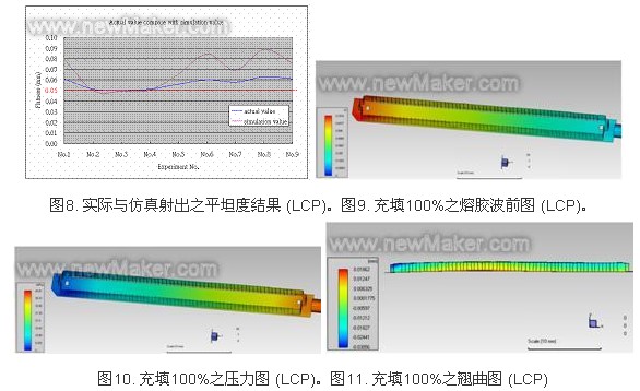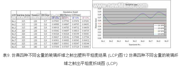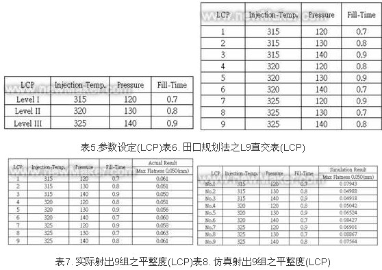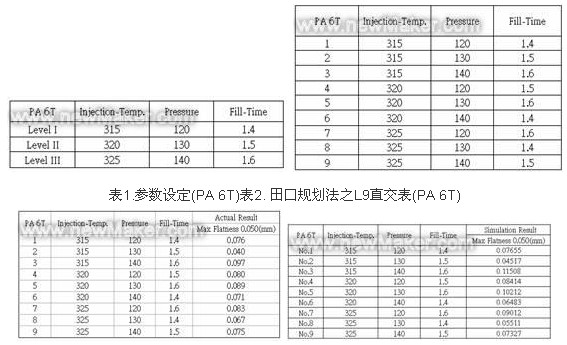 [page]塑料射料LCP在已設(shè)定射出溫度、射出壓力、充填時(shí)間之條件參數(shù)后,再設(shè)定仿真之各參數(shù),如表5所示。透過(guò)田口方法實(shí)驗(yàn)規(guī)劃,可得L9直交表,如表6所 示。依據(jù)L9直交表,可清楚得知有9組田口規(guī)劃之實(shí)驗(yàn)參數(shù),再分別針對(duì)這9組參數(shù),實(shí)際作射出成形,并量測(cè)實(shí)際翹曲度,量測(cè)之結(jié)果,大部份數(shù)據(jù)皆不符合塑 料翹曲度(Flatness) 0.05mm規(guī)格內(nèi),如表7所示。仿真之最佳化參數(shù)為第三組,其參數(shù)為射出溫度315℃、射出壓力 140 MPa 、充填時(shí)間0.9 s,如圖3所示。