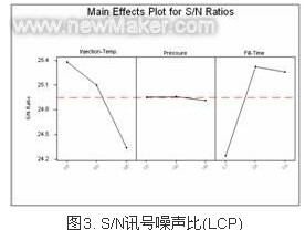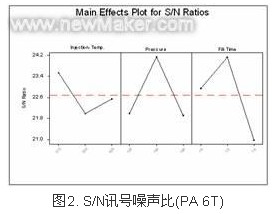 由實(shí)驗(yàn)數(shù)據(jù)輸入田口法計(jì)算機(jī)程序后,經(jīng)因子變動(dòng)計(jì)算,可得S/N(訊號(hào)/噪聲比),如圖2所示。由S/N得到最佳化參數(shù)為,射出溫度315℃、射出壓力 130 MPa、充填時(shí)間1.5 s。此最佳化參數(shù)出現(xiàn)于田口規(guī)劃法L9直交表內(nèi)之第二組實(shí)際數(shù)據(jù),而且實(shí)際射出與仿真射出所得之?dāng)?shù)據(jù)也都是第二組為最佳的,由此可得知PA 6T田口法最佳化組合與實(shí)際射出與仿真射出是互相對(duì)應(yīng)的,符合理論與實(shí)務(wù)相互映證,最佳化成形之塑料其平坦度為0.04mm,符合平坦度不超過(guò) 0.05mm之目標(biāo)值。
