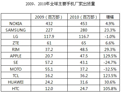 水清木華研究中心指出,經(jīng)歷2009年的衰退后,2010年全球手機出貨量大增,增幅高達20.8%,達到14.25億部。2011年全球經(jīng)濟面臨諸多挑戰(zhàn),通貨膨脹嚴(yán)重。由于2010年的基數(shù)已高,2011年大部分企業(yè)無法維持大幅度成長,因此預(yù)計2011年全球手機出貨量微幅成長5.1%,達到 14.98億部。2010年大幅度成長的主要動力來自智能手機,2009年智能手機出貨量僅1.89億部,2010年大幅增長到3.3億部。