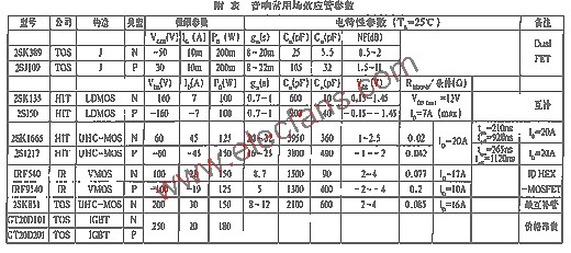 場(chǎng)效應(yīng)晶體管在音響數(shù)字化的今天應(yīng)用范圍越來越廣。其原理、優(yōu)點(diǎn)和使用常識(shí)在一些工具書及報(bào)刊上已有不少論述,在此不再贅述。本文通過兩個(gè)容易被發(fā)燒友特別是初學(xué)者所忽略的要點(diǎn)來說明場(chǎng)效應(yīng)管的合理應(yīng)用。目前,應(yīng)用于音響領(lǐng)域的場(chǎng)效應(yīng)管包括結(jié)型管(JFET)和絕緣柵場(chǎng)效應(yīng)管(MOsFET),而后者又分為LDMOS、VMOS及近年出現(xiàn)的UHC、IGBT等,并且至今仍在不斷發(fā)展與完善之中。