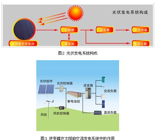 太陽能交流發電系統是由光伏組件、光伏控制器、蓄電池組和逆變器共同組成(如圖1),,其中,逆變器是最重要的部分。逆變器是一種電源轉換裝置,其主要功能是將蓄電池的直流電逆變成交流電,圖2表示了逆變器在太陽能交流發電系統中的作用。