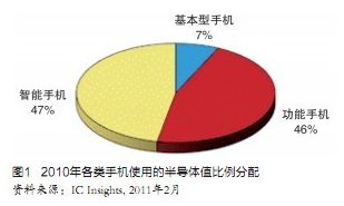 平均算來,現(xiàn)今一部手機(jī)使用的半導(dǎo)體價值約30美元,世界全部手機(jī)使用的半導(dǎo)體總值約占半導(dǎo)體市場近20%,是僅次于PC和消費(fèi)電子的第三大應(yīng)用產(chǎn)品,足見其影響力。智能手機(jī)的半導(dǎo)體含量更大,它裝備更加優(yōu)良的處理器,更多的DRAM和NAND。據(jù)稱,它與基本手機(jī)半導(dǎo)體含量之比約為9:1,其對半導(dǎo)體業(yè)的重要性更可見一斑。市場調(diào)研公司IC Isights報告指出,2010年世界手機(jī)使用半導(dǎo)體產(chǎn)品共425億美元,其中智能手機(jī)(Smartphone)200億美元,占47%,首次超過增強(qiáng)型手機(jī)(Enhanced),基本型手機(jī)(Basic)用半導(dǎo)體僅30億美元,占7%(見圖1)。預(yù)計(jì)2014年手機(jī)使用半導(dǎo)體將增至555億美元,年均增長率7.5%,智能手機(jī)使用半導(dǎo)體則將以每年20%的速度迅猛成長,屆時將達(dá)416億美元,獨(dú)占手機(jī)用半導(dǎo)體的75%,相反基本型手機(jī)屆時將進(jìn)一步縮減至僅為16億美元,只及2010年的一半。