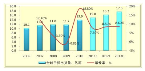 目前,西歐各國、美國、日本、韓國等移動(dòng)通信發(fā)達(dá)國家的手機(jī)用戶趨于飽和,而非洲、拉丁美洲、東歐 以及俄羅斯、印度、巴西等地區(qū)和國家的移動(dòng)通信市場進(jìn)入高速發(fā)展期,這些新興市場對3G手機(jī)、智能手機(jī)的需求更為強(qiáng)烈,并已成為全球手機(jī)銷售增長的主要領(lǐng)域。預(yù)計(jì)2010-2013年全球手機(jī)出貨量將保持7%以上的增速。