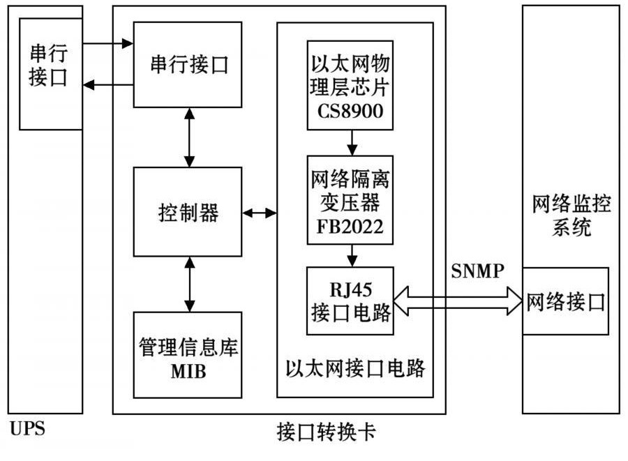 用戶可根據(jù)自己的需求,定義包含UPS監(jiān)控信息參數(shù)的管理信息庫,并將其保存。接口轉(zhuǎn)換卡的串行接口電路與UPS上的串行接口相接,控制器通過控制串行接口電路來獲取UPS的工作信息。處理器將接收到的數(shù)據(jù)與管理信息庫中所定義的數(shù)據(jù)一一對(duì)應(yīng)并保存,并通過以太網(wǎng)接口電路定時(shí)向網(wǎng)絡(luò)管理系統(tǒng)發(fā)送用戶需要的即時(shí)信息。網(wǎng)絡(luò)管理系統(tǒng)對(duì)管理信息庫中的變量進(jìn)行操作,向接口轉(zhuǎn)換卡發(fā)送查詢和設(shè)置節(jié)點(diǎn)等命令,處理器通過查詢MIB中相應(yīng)的節(jié)點(diǎn)信息,根據(jù)串口通信協(xié)議向UPS發(fā)出相應(yīng)的命令,再將得到的結(jié)果返回給網(wǎng)絡(luò)監(jiān)控系統(tǒng)。