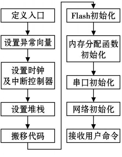 本設(shè)計(jì)中采用了帶有SNMP協(xié)議的μClinux操作系統(tǒng),實(shí)現(xiàn)方式簡單。不僅完成了串行接口到網(wǎng)絡(luò)接口的轉(zhuǎn)換,還使用戶可以通過監(jiān)控界面按照SNMP協(xié)議標(biāo)準(zhǔn)進(jìn)行統(tǒng)一管理。對(duì)于μClinux系統(tǒng)U-boot是最合適的Bootloader,其設(shè)計(jì)過程如圖5所示。